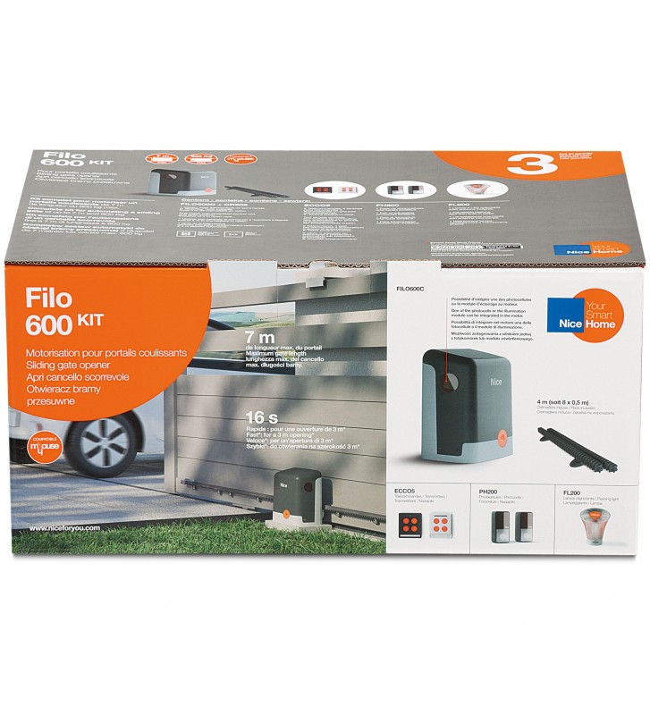 Nice Home FILO 600 este un kit de automatizare pentru porti culisante, compatibil cu porti care au greutatea de pana la 600kg si o lungime de pana la 7m.